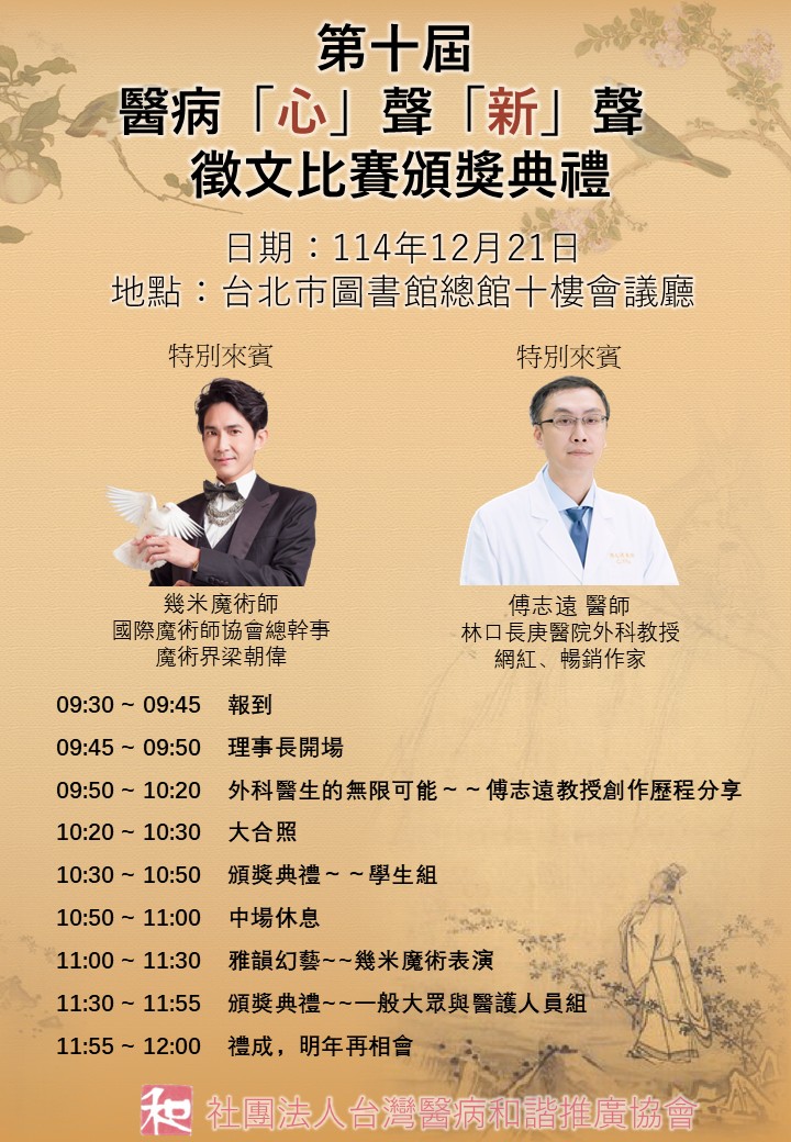 | 2025/12/07 | 12/21(日)9:30-12:00於台北市圖書館總館10F會議廳舉辦「醫病心聲徵文頒獎典禮」。活動免費、不須報名!歡迎闔家到場一起享受暢銷書作家演講及歡樂的國際級魔術表演! |