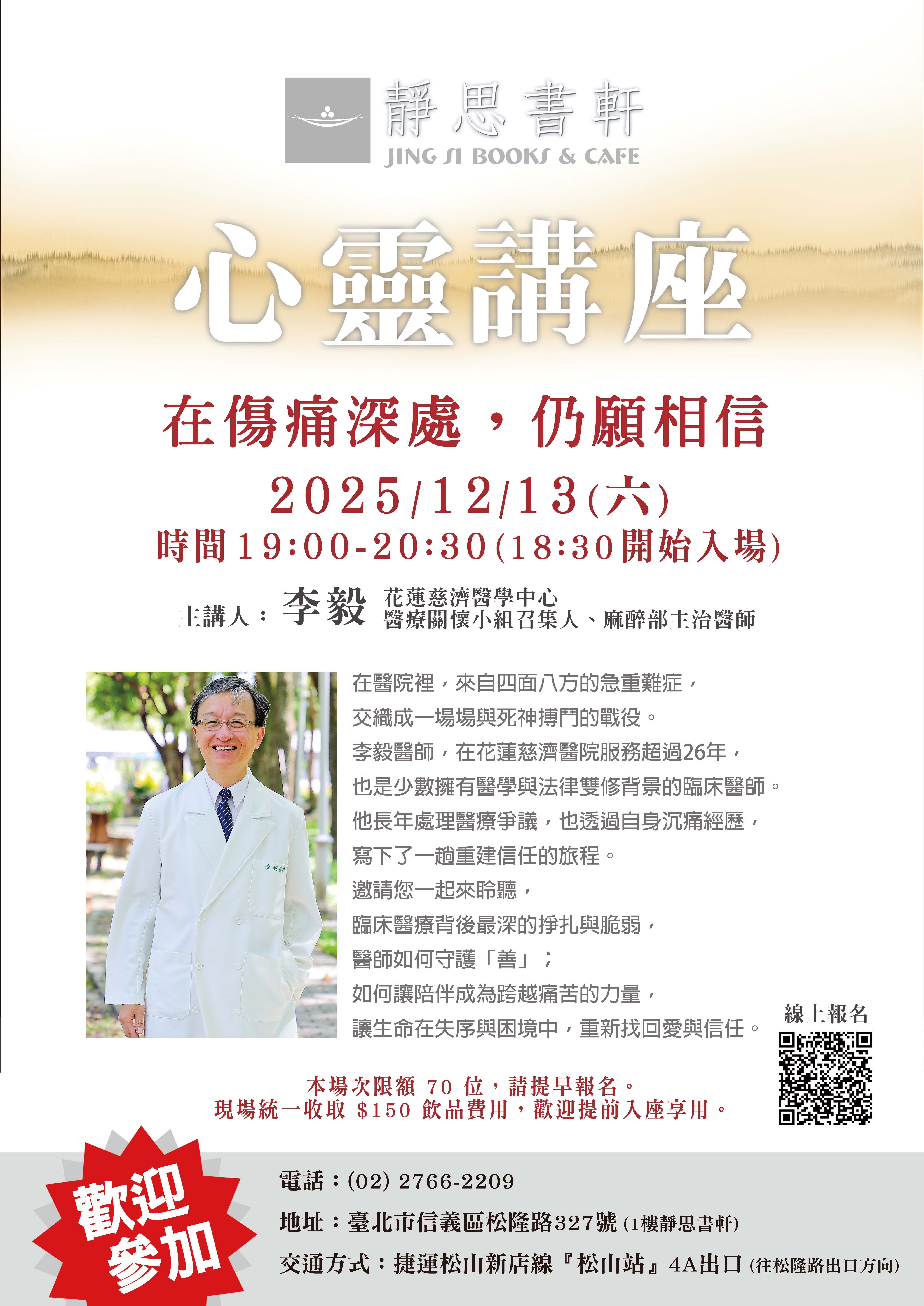 | 2025/12/13 | 2025/12/13 19:00-20:00 心靈講座-在傷痛深處,仍願相信 |