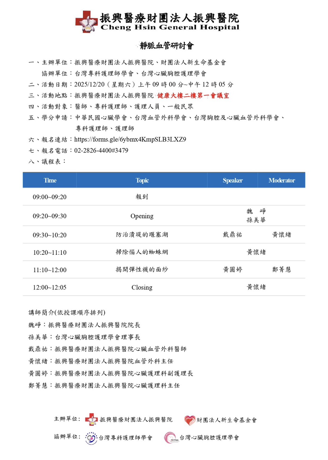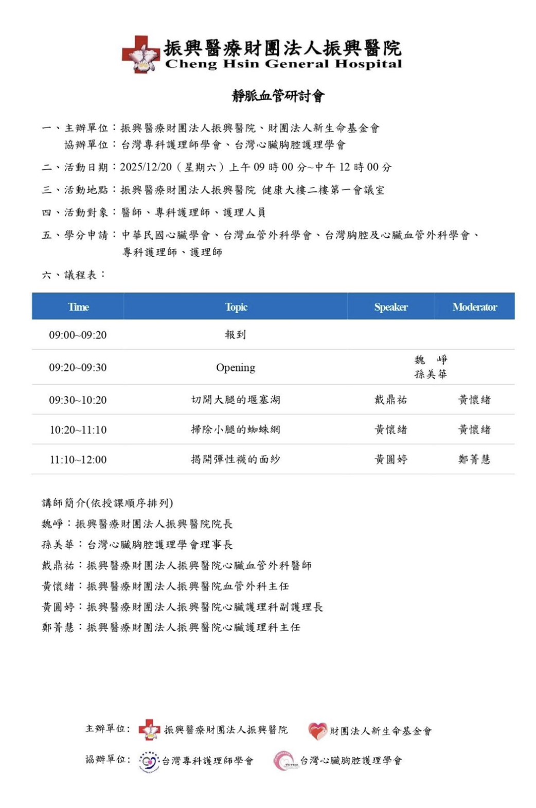| 2025/09/10 | 兩岸專題交流:「人工智慧在心血管護理的實證應用」報名截止 |